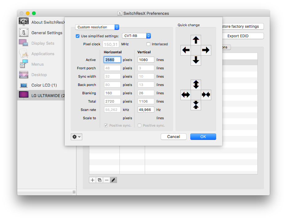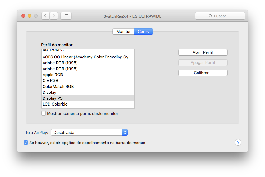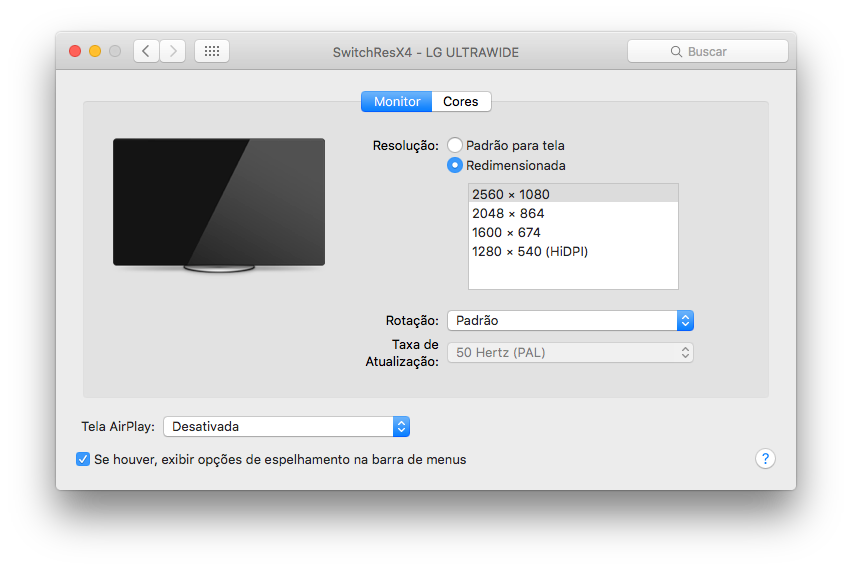 Comprei um monitor UltraWide LG 25UM57-P e descobri que nativamente o MacBook Air 11, não gera a resolução de tela de 2560x1080, mas encontrei uma solução com o app SwitchResX. Anexo a configuração usada e que funcionou perfeitamente, basta seguir as instruções do fornecedor para liberar o macOS e depois configurar a resolução em Custom conforme print, reiniciar, após reiniciar a nova resolução estará disponível para uso.